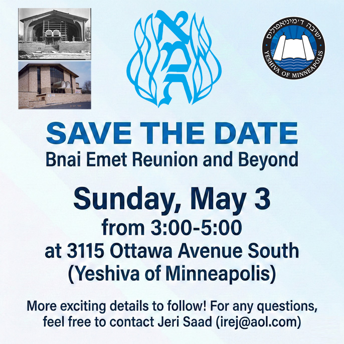 Bnai Emet holds a special place in the heart of all of its former members and made a profound impact on the Jewish community at large through the years. We are excited to share we are planning a Bnai Emet Reunion at Yeshiva of Minneapolis on Sunday, May 3, which will offer an opportunity for guided tours of the newly renovated building and a great chance to reconnect and schmooze with friends and also enjoy some infamous B’nai Emet delicacies.